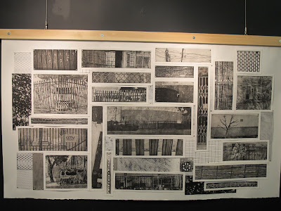 Mike Fell, che prendendo spunto dall'affumicatura del salmone che viene fatta proprio sotto la galleria, ha pensato bene di "affumicare" le sue stampe. Mike spiega "...ho affumicato queste stamper per 4 ore con il fumo ottenuto bruciando il legno avanzato dal blocco intagliato. Il processo è risultato in un leggero inscurimento dell'inchiostro, anche se io speravo in un maggiore ingiallimento e arricciamento della carta." Se qualcuno se lo stesse chiedendo ebbene sì, ho provato ad annusarle (molto discretamente anche se WG mi ha poi confessato di averlo fatto anche lei) e sono rimasta un po' delusa perché non odoravano assolutamente di affumicato : ))