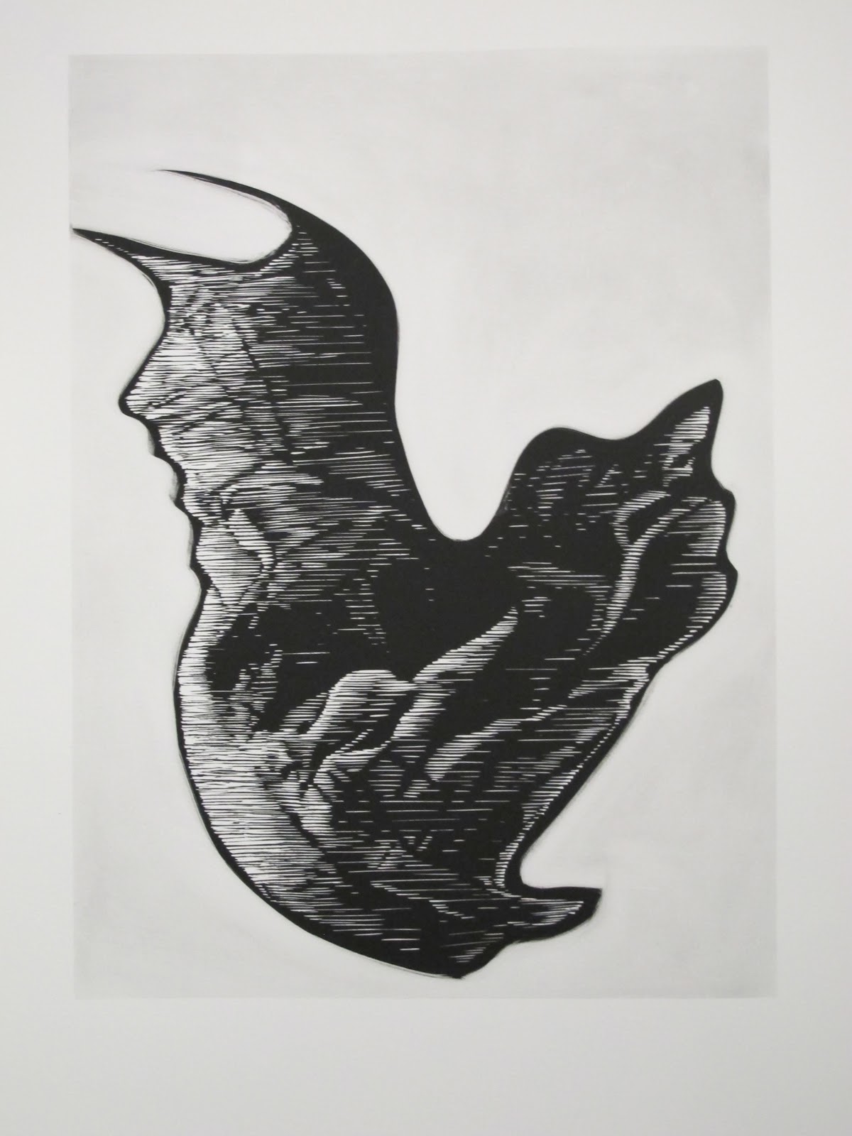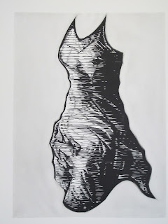 Tra le opere più curiose sicuramente questa di Mike Fell, che prendendo spunto dall'affumicatura del salmone che viene fatta proprio sotto la galleria, ha pensato bene di "affumicare" le sue stampe. Mike spiega "...ho affumicato queste stamper per 4 ore con il fumo ottenuto bruciando il legno avanzato dal blocco intagliato. Il processo è risultato in un leggero inscurimento dell'inchiostro, anche se io speravo in un maggiore ingiallimento e arricciamento della carta." Se qualcuno se lo stesse chiedendo ebbene sì, ho provato ad annusarle (molto discretamente anche se WG mi ha poi confessato di averlo fatto anche lei) e sono rimasta un po' delusa perché non odoravano assolutamente di affumicato : ))
