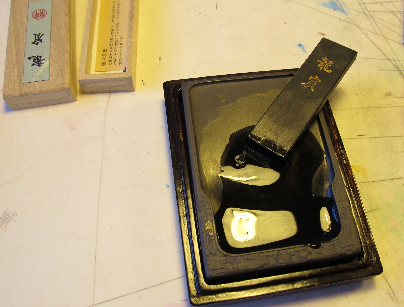 inchiostro sumi per calligrafia dopo essere stato "macinato" e sciolto con poca acqua