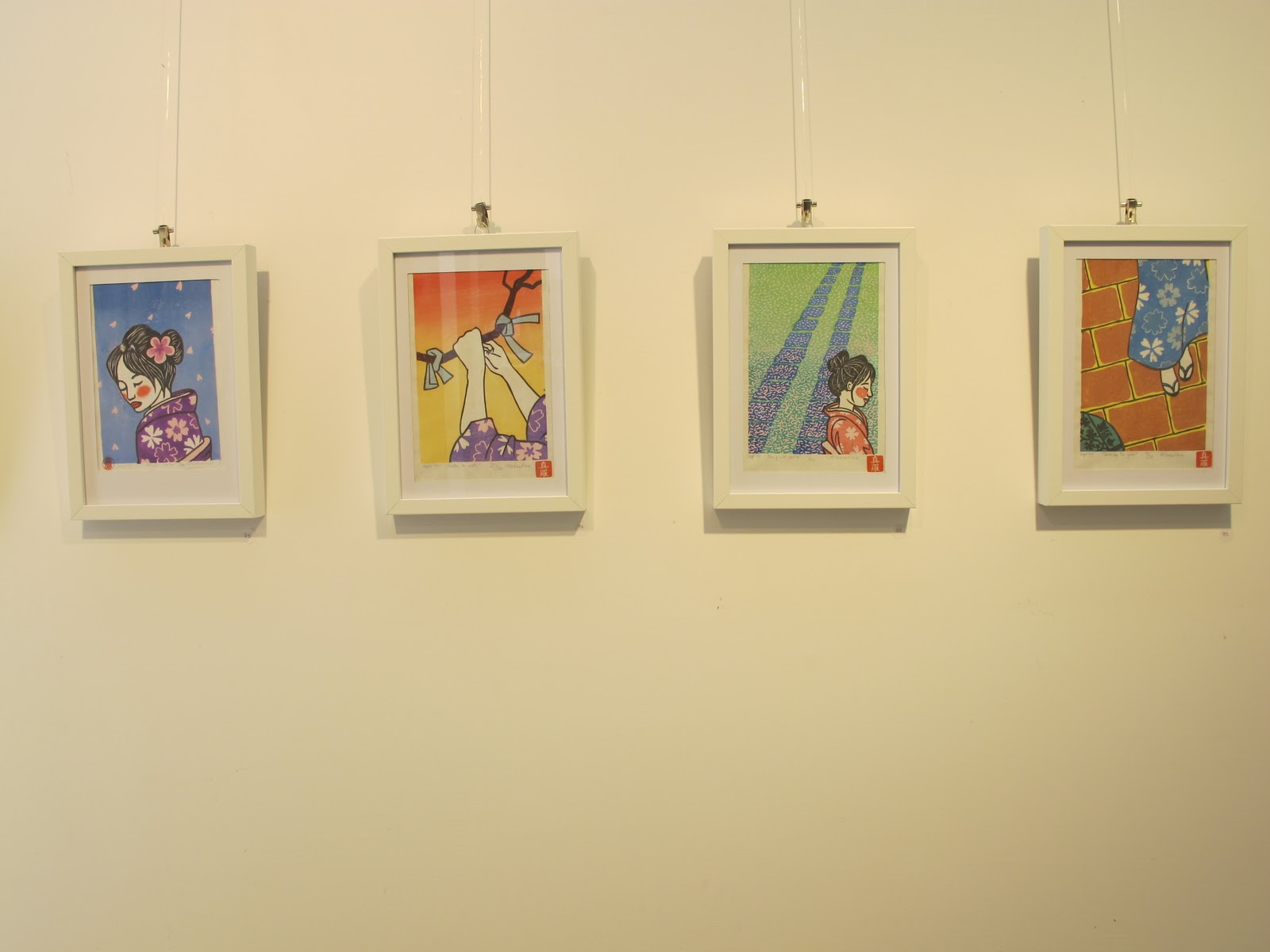 Sotto invece una piccola cornice con gli strumenti principali della xilografia giapponese; l'idea è piaciuta subito e mi ha reso la vita molto più semplice quando cercavo di spiegare i vari passaggi per creare una stampa. Oltre a questa in vetrina (come potete vedere dalla prima foto) abbiamo esposto qualche blocco di legno, anche qui per dare subito un'idea di come di realizza una stampa xilografica.