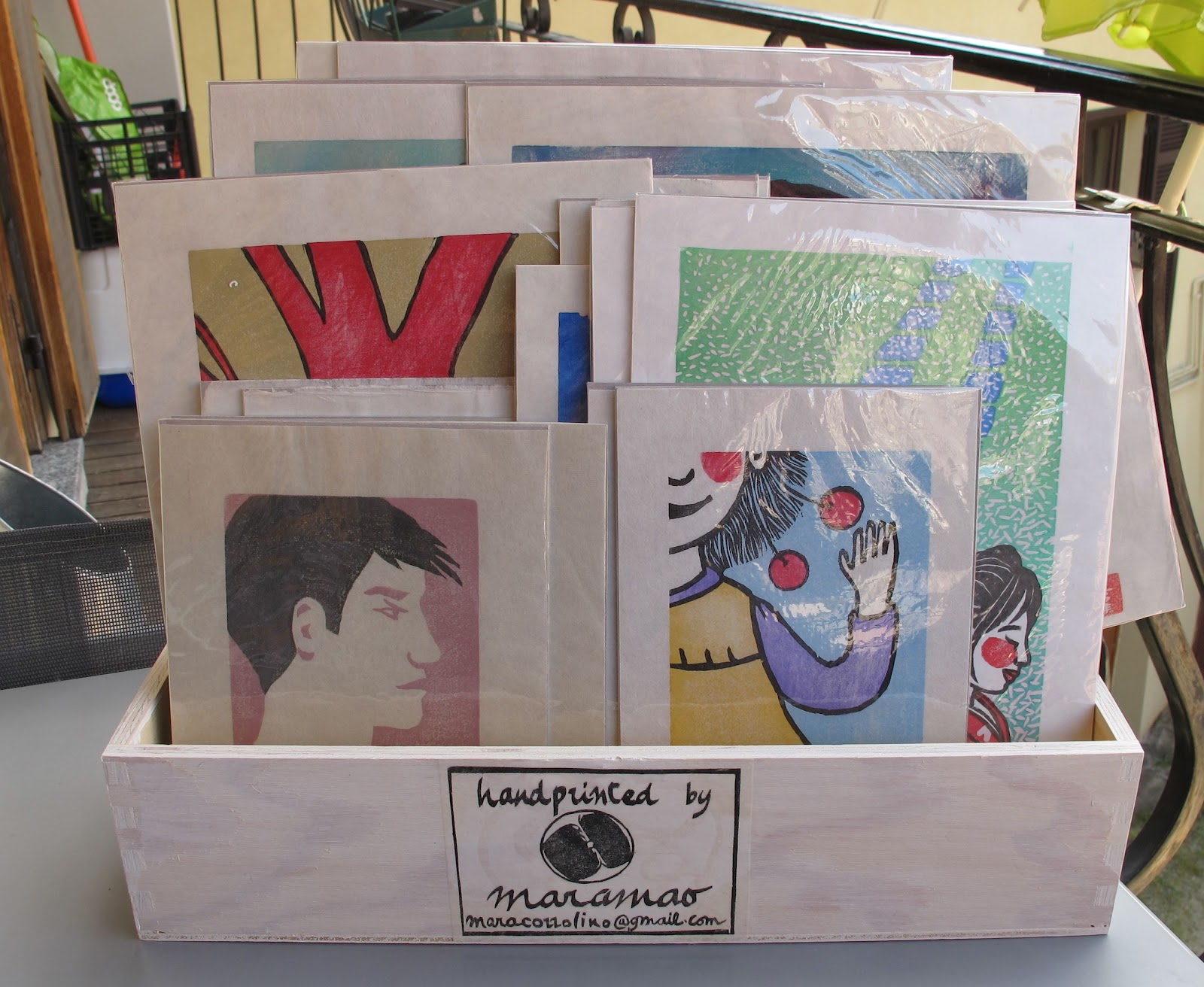 E per chi si domandasse come fosse andata a finire l'avventura packaging etc. eccovi una foto dell'espositore, finalmente terminato e con tutte le mie stampe belle in posa e pronte per essere scartabellate e possibilmente scelte e portate a casa!