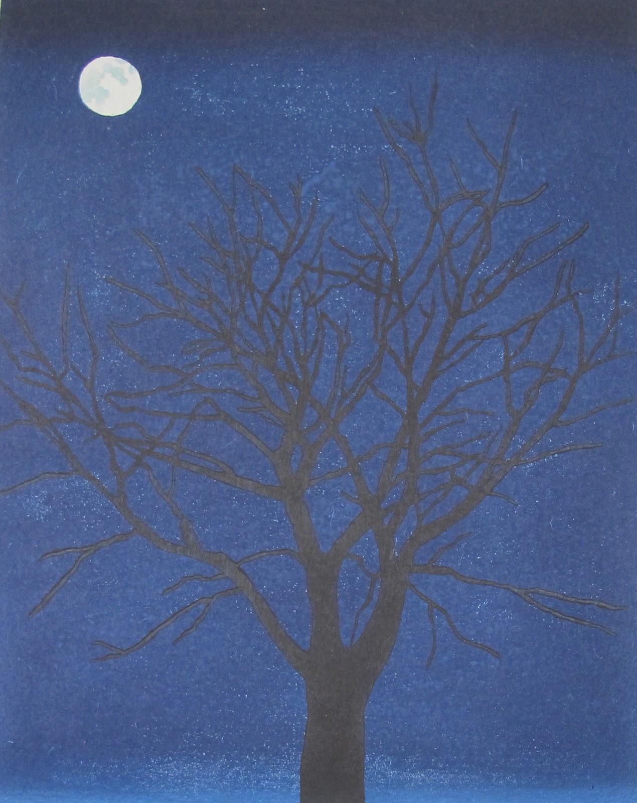 Niente di particolare invece su questa seconda, se non che all'inizio la luna avrebbe dovuto essere semplicemente del colore della carta. Pensavo che essendo questa non troppo sbiancata la luna sarebbe spiccata ma non esageratamente, invece complice forse il colore tendente al giallo in contrasto con lo sfondo blu, nelle stampe di prova era letteramente accesa come una lampadina. Quindi ho semplicemente intagliato sempre sul blocco del keyblock (che fortuna che non avevo "pulito" così in là : ) qualche macchia lunare in modo che la mia luna sia ancora luminosa ma non troppo.