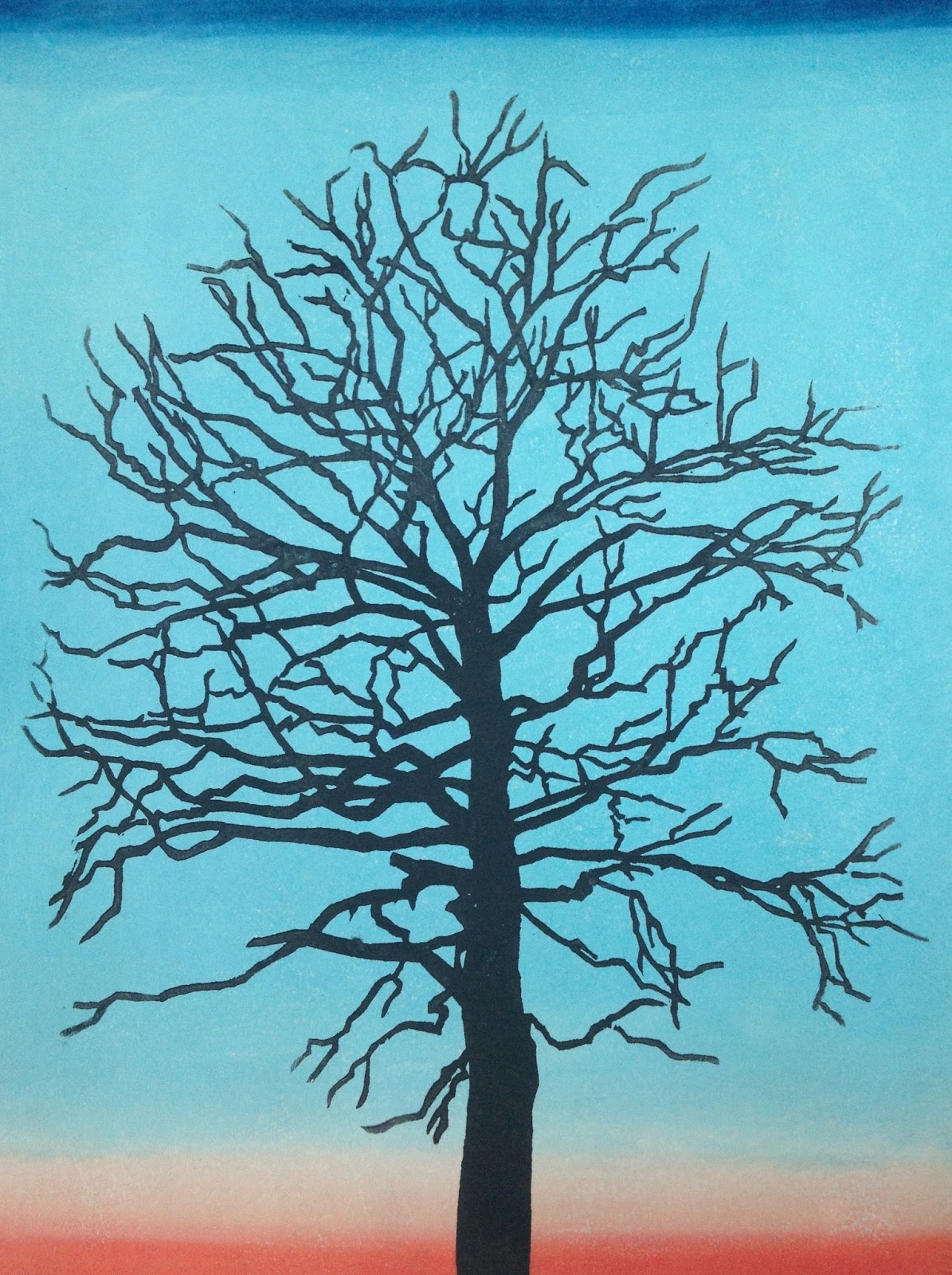 Non che ci sia proprio riuscita ammettiamolo, ma lì per lì ero stata anche contenta del risultato, soprattutto di aver utilizzato un solo blocco per lo sfondo (mentre qui non so se vi ricordate, ne avevo usati 2). Stampato dunque per 3 volte lo sfondo azzurro che si perde nel bianco della carta e poi stampato per 2 volte la parte rossa; per l'albero come al solito ci sono voluti 2 passaggi per rendere il nero intenso che volevo.