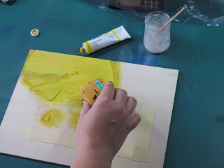 Si inchiostra il blocco con colori ad acqua (in questo caso acquerello) e colla nori utilizzando speciali pennelli chiamati bake: