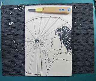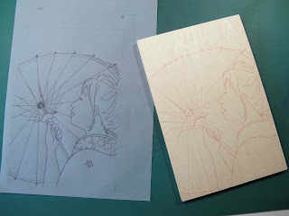 A questo punto riporto il disegno sul blocco (a rovescio, in modo che una volta stampato ritorni nel verso originale) con della carta carbone. In questo caso come keyblock utilizzerò un blocco di legno shina 9mm dell'esatta dimensione della stampa finita per cui per stampare userò un floating kento (vedere ultima immagine), riporto comunque la posizione del floating kento sulla carta da lucido per quando dovrò traferirla su blocchi colore.