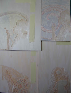 Prima di iniziare ad intagliare i blocchi colore, verifico di non avere fatto errori grossolani rispetto al disegno iniziale, e nel caso aggiusto il disegno sulla velina.