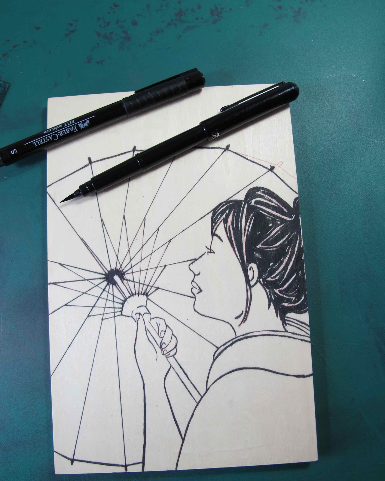 Riprendo il disegno sul blocco con dei pennelli o pennarelli per dare più movimento alle linee: